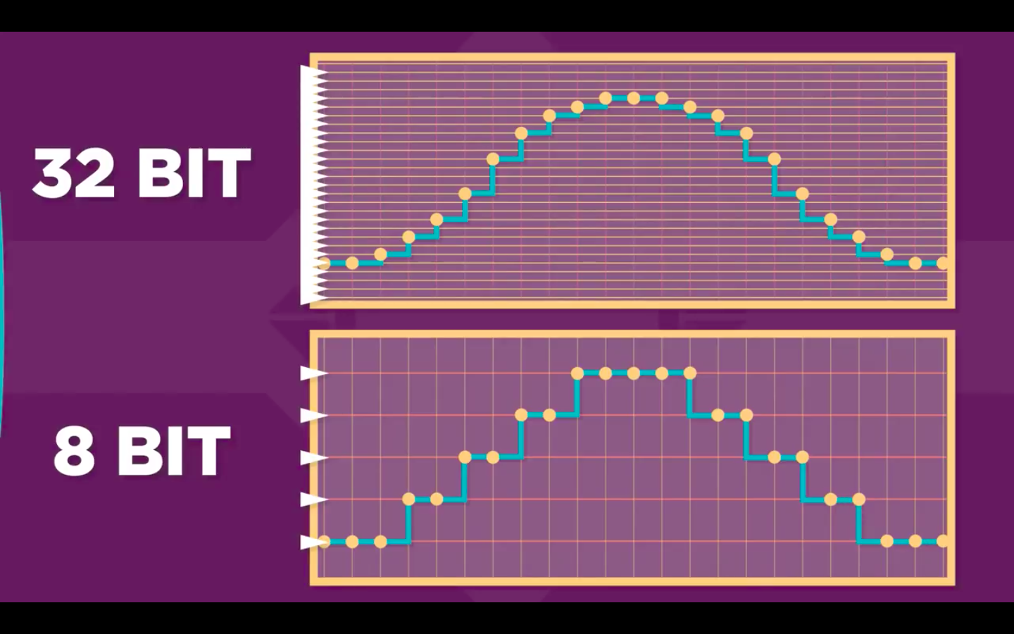 Every sound is basically a series of vibrations in the air. Vibrations can be represented graphically as a waveform. Any point on this waveform can be represented by a number. And this way, any sound can be broken down into a series of numbers. If you want higher quality sound, you will pick 32-bit audio or an 8-bit audio. More bits means a higher range of numbers.