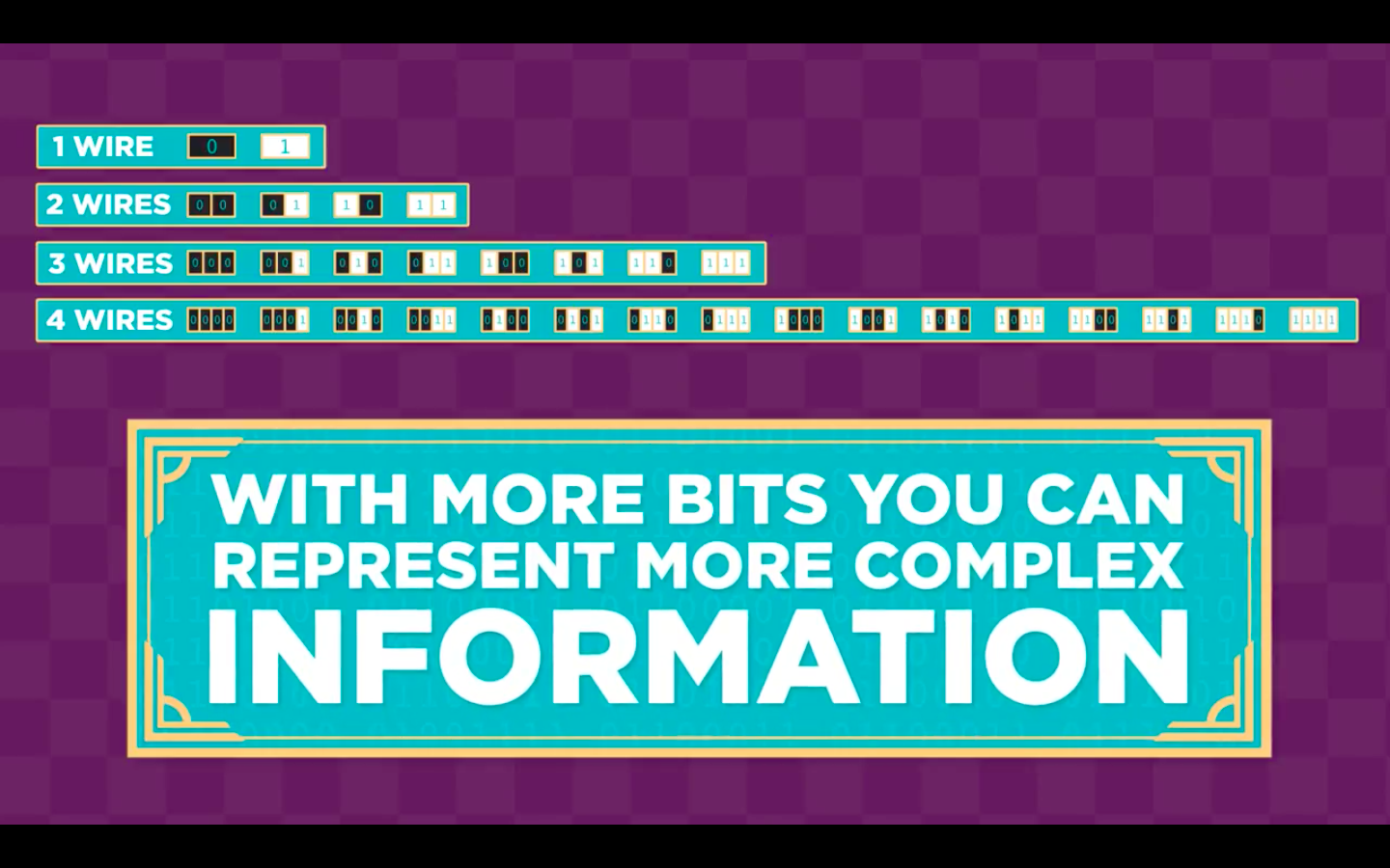 If you use more wires you get more bits: more ones and zeros. With more bits you can represent more complex information. But to understand that, we need to learn about something called the binary number system.