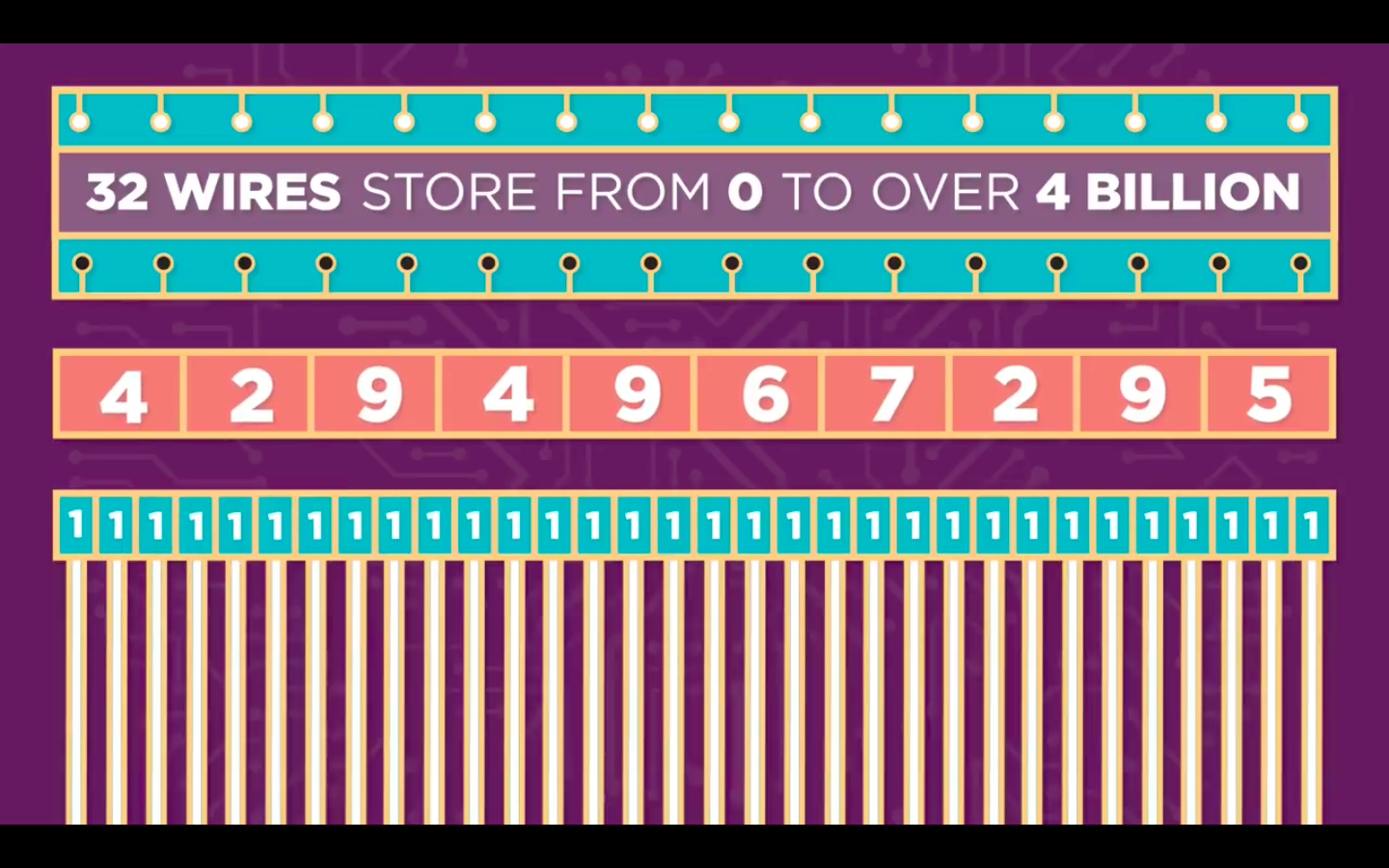 Here's how this works. In a decimal number system we're all used to, each position in a number has a different value. There's a 1 position, the 10 position, the 100 position, and so on. For example, a 9 in the 100 position is a 900. In binary, each position also carries a value. But instead of multiplying by 10 each time, we multiply by 2. So there's the 1 position, the 2 position, the 4 position, the 8 position, and so on. For example, the number 9 in binary is 1001. To calculate the value, we add 1 times 8, plus 0 times 4, plus 0 times 2, plus 1 times 1. Almost nobody does this math because computers do it for us. What's important is that any number can be represented with only ones and zeros, or by a bunch of wires that are on or off. The more wires you use, the larger the numbers you can store. With 8 wires, you can store numbers between 0 and 255. That's 8 ones. With just 32 wires, you can store all the way from 0 to over 4 billion. Using the binary number system, you can represent any number you like.