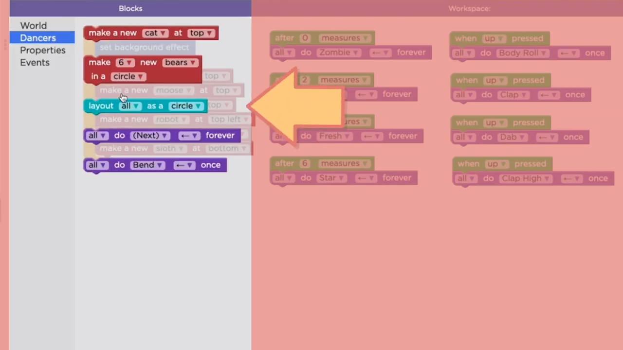 If you look in the tool box, you'll find some brand new blocks that you haven't seen before. For instance, you can use the layout block to arrange the dancers in different ways on the screen.