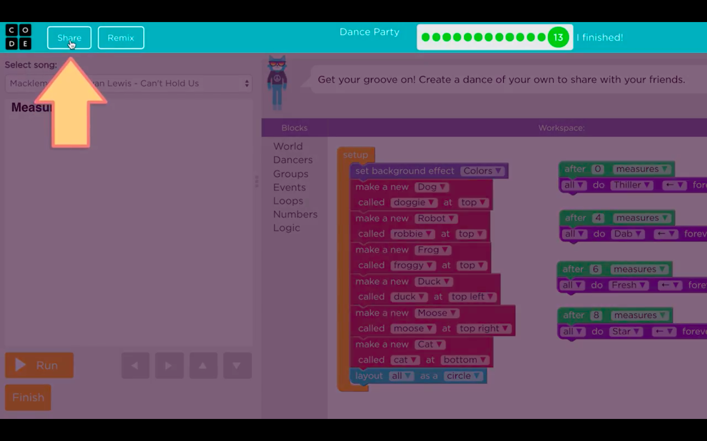 Congratulations! You've just learned the basics of computer science. Now you can use these blocks to create a dance party of your own design to share with your friends.