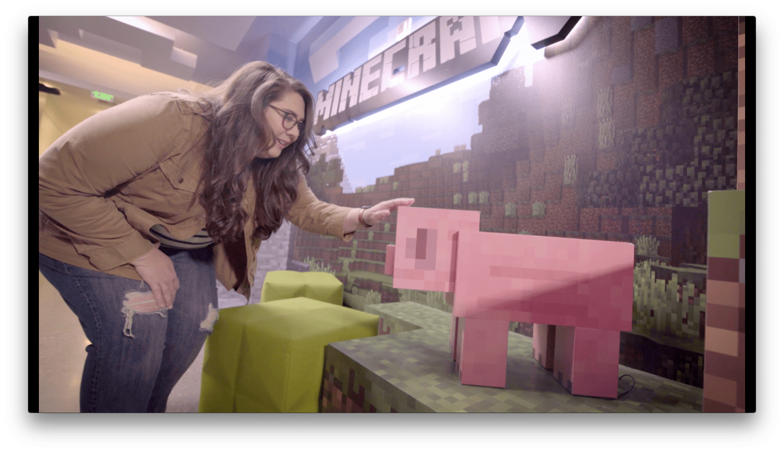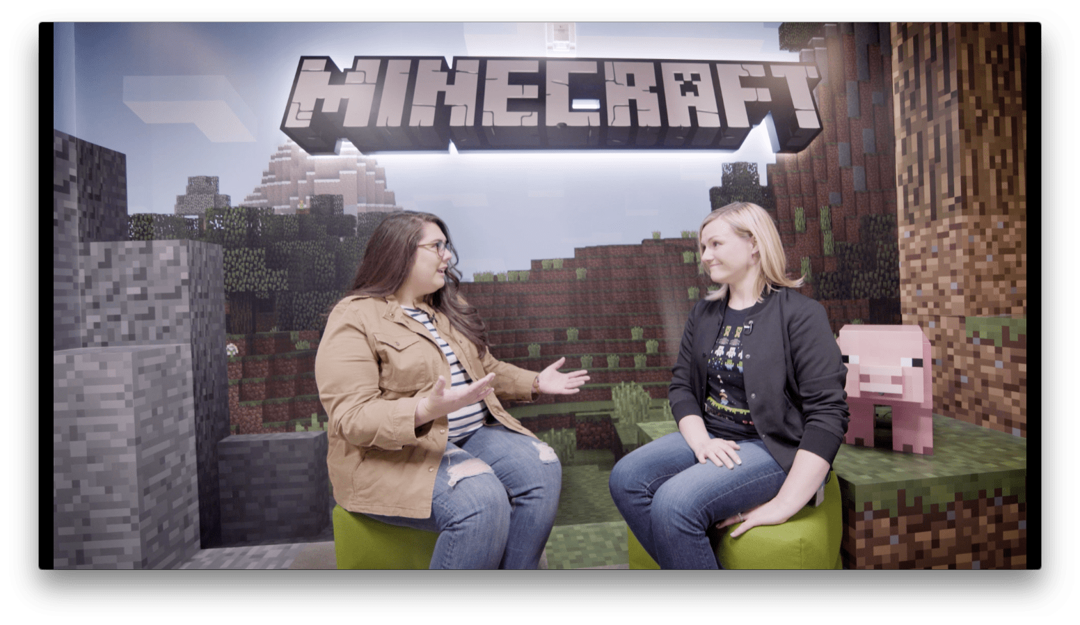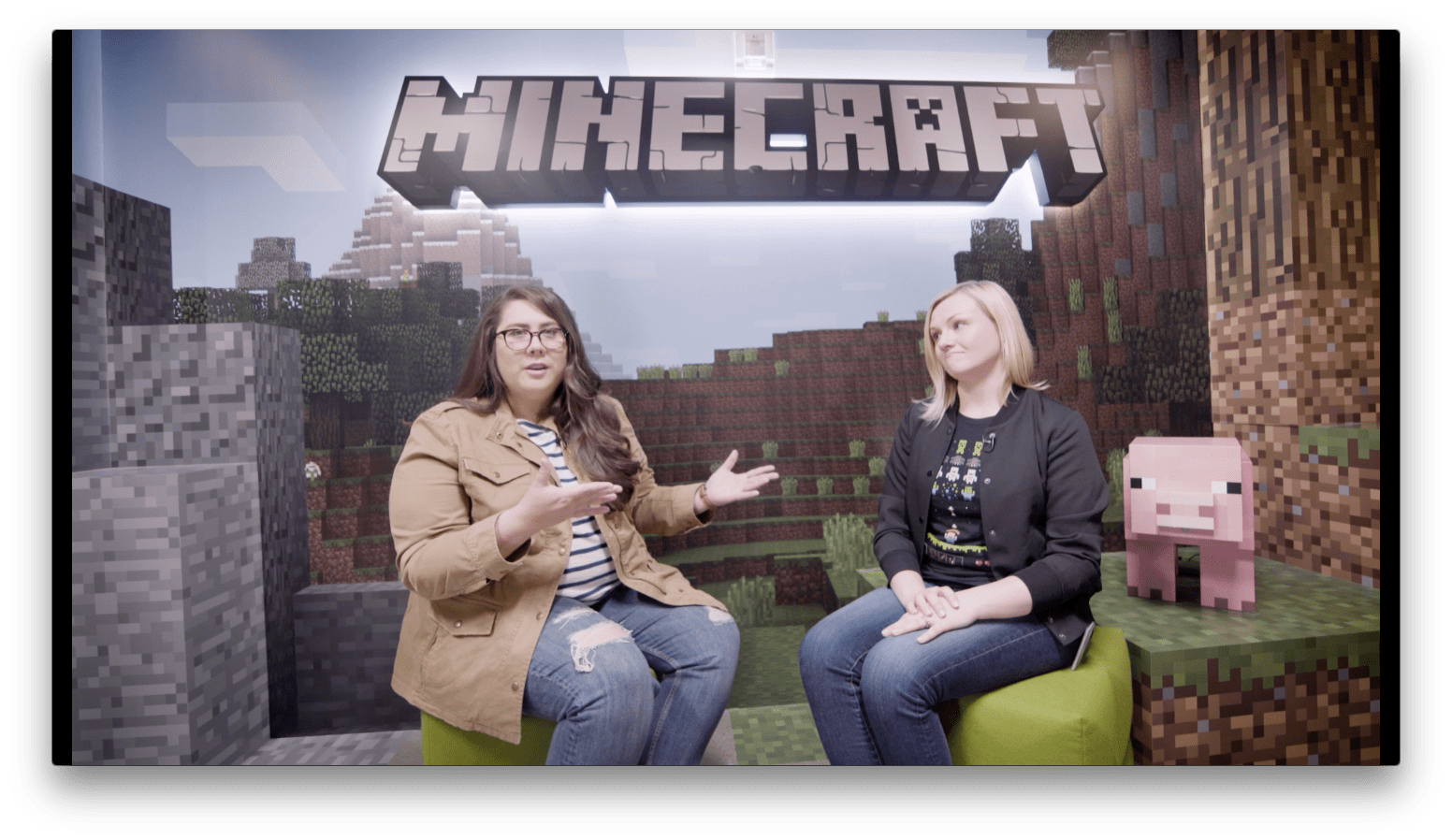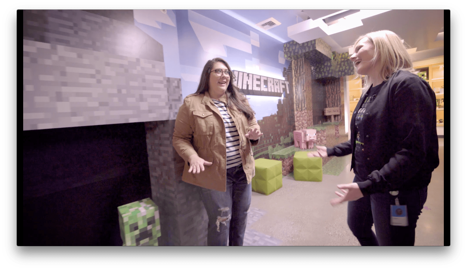 Stacy: This is amazing. So you work here every day as a developer, right? Katie: Yeah, it's pretty awesome. I'm a developer on the Minecraft marketplace team. Stacy: How many coding languages do you know? Katie: In my career I've probably worked with over a dozen. Stacy: A dozen? Katie: Yeah. Stacy: So now, you wouldn't happen to know anything about this little golem guy that calls himself the Agent? Katie: We use the Agent to do things that Steve or Alex can't, like go across lava. Stacy: Well, I want to learn how to code, and they want to learn how to code, so what is one of the first things that you need to know when you're learning?