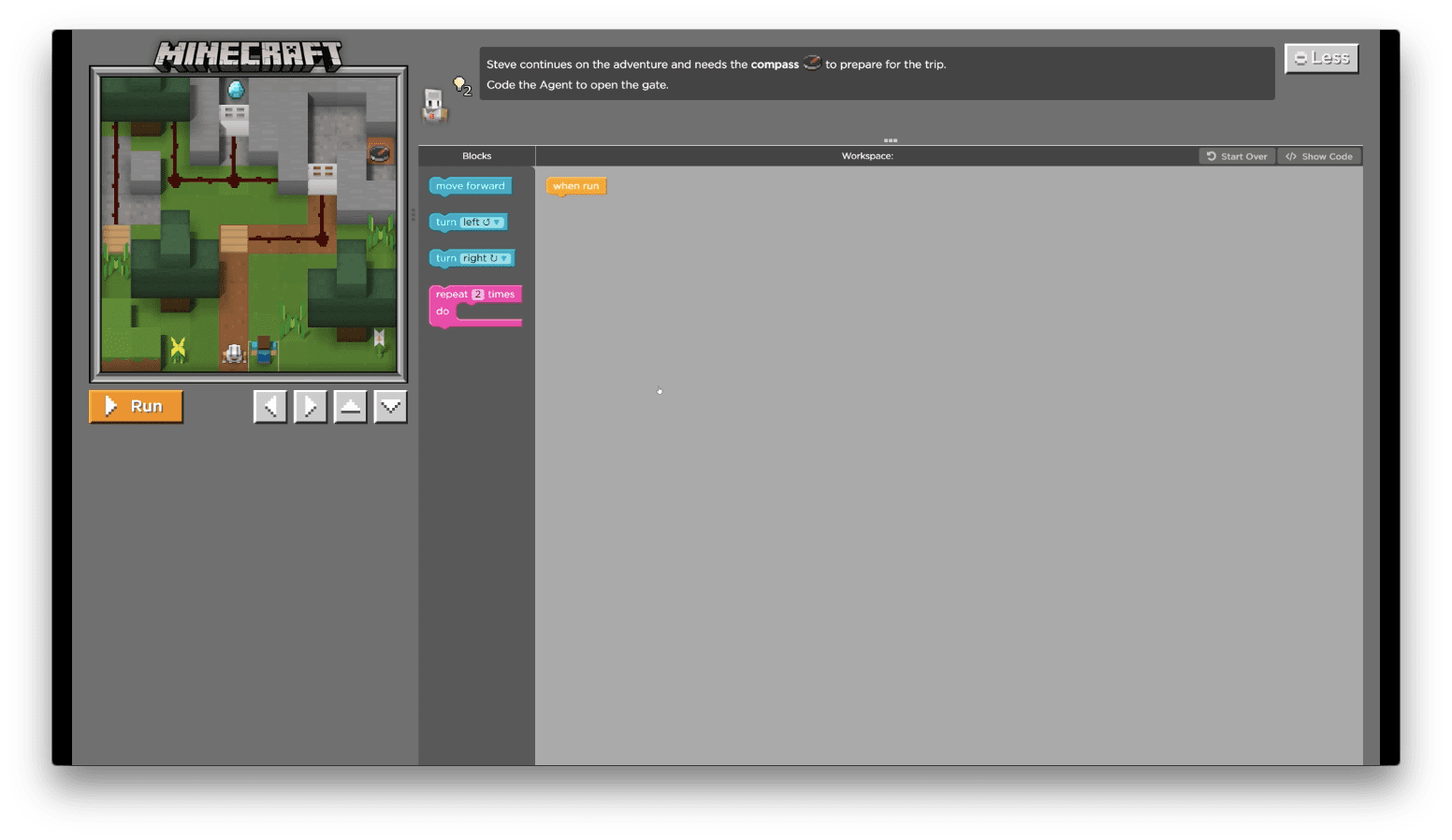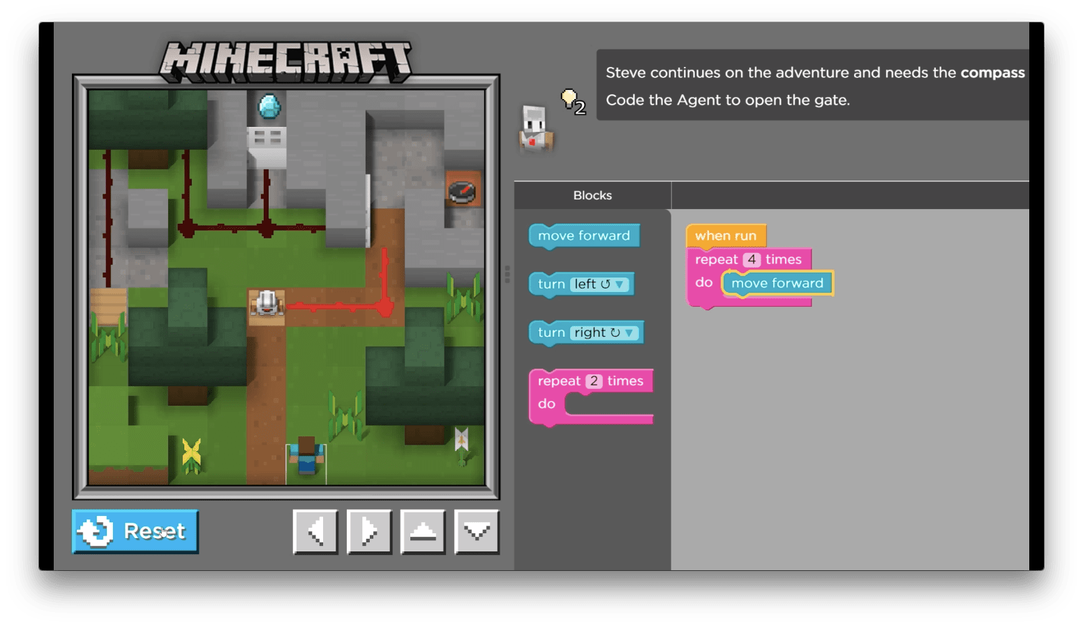 You can put turns and multiple commands in the repeat block too, but for now try using a repeat to move the Agent forward a few steps. Remember, if you get stuck on a puzzle you can always hit the blue reset button and try again.
