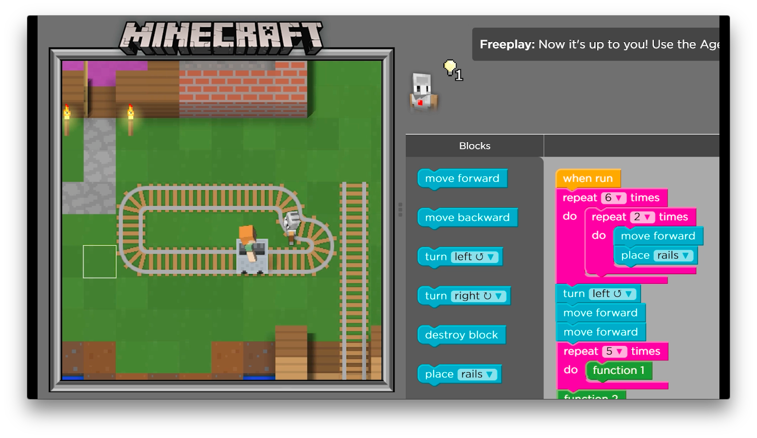Now, it's time for the free play level, where you are the developer. Use any remaining time to write your own functions to explore, mine, and build.