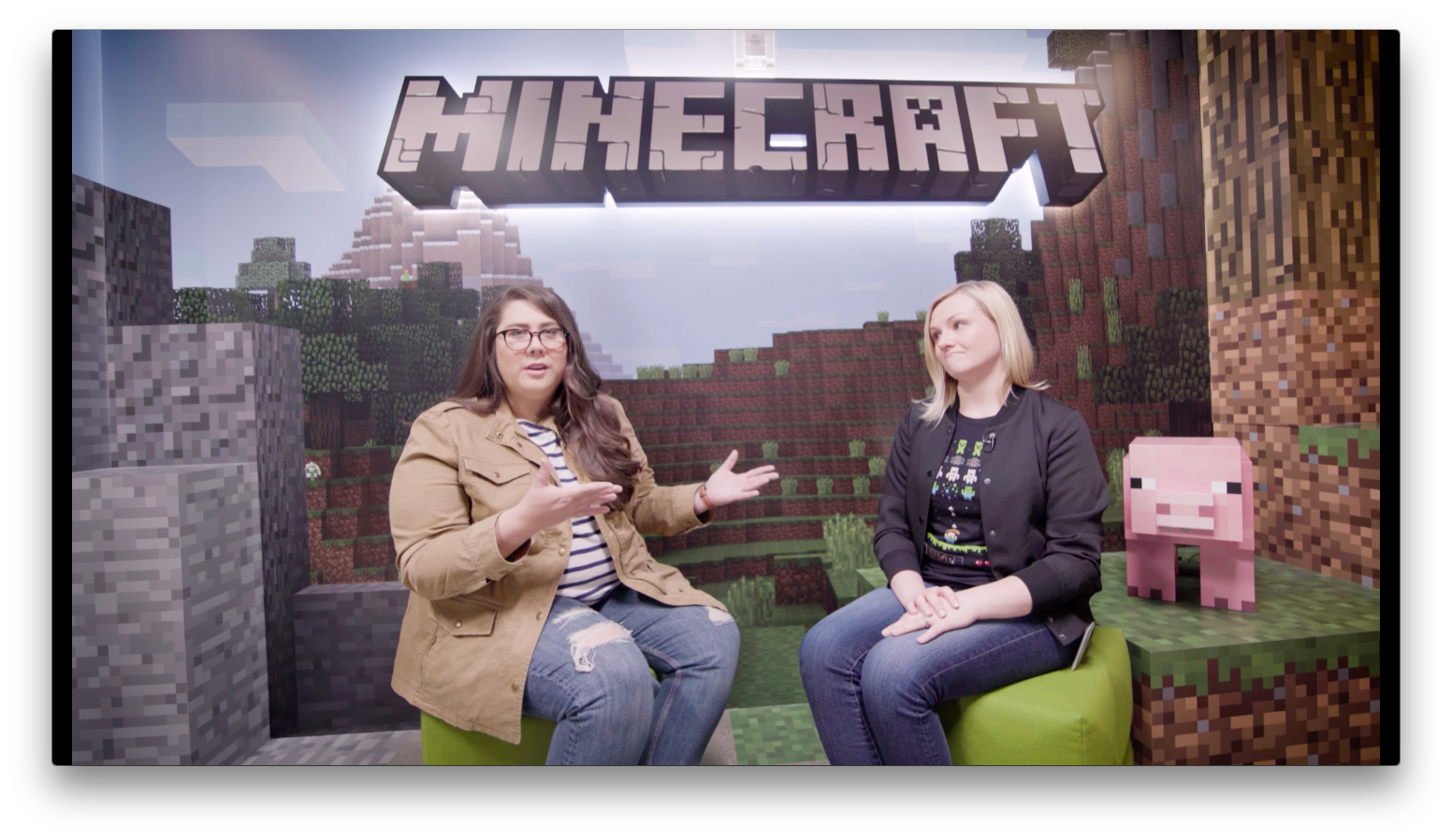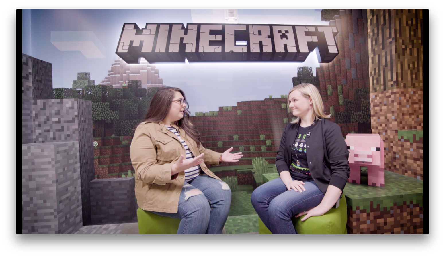 Stacy: This is amazing. So you work here every day as a developer, right? Katie: Yeah, it's pretty awesome. I'm a developer on the Minecraft marketplace team. Stacy: How many coding languages do you know? Katie: In my career I've probably worked with over a dozen. Stacy: A dozen? Katie: Yeah. Stacy: So now, you wouldn't happen to know anything about this little golem guy that calls himself the Agent? Katie: We use the Agent to do things that Steve or Alex can't, like go across lava. Stacy: Well, I want to learn how to code, and they want to learn how to code, so what is one of the first things that you need to know when you're learning?