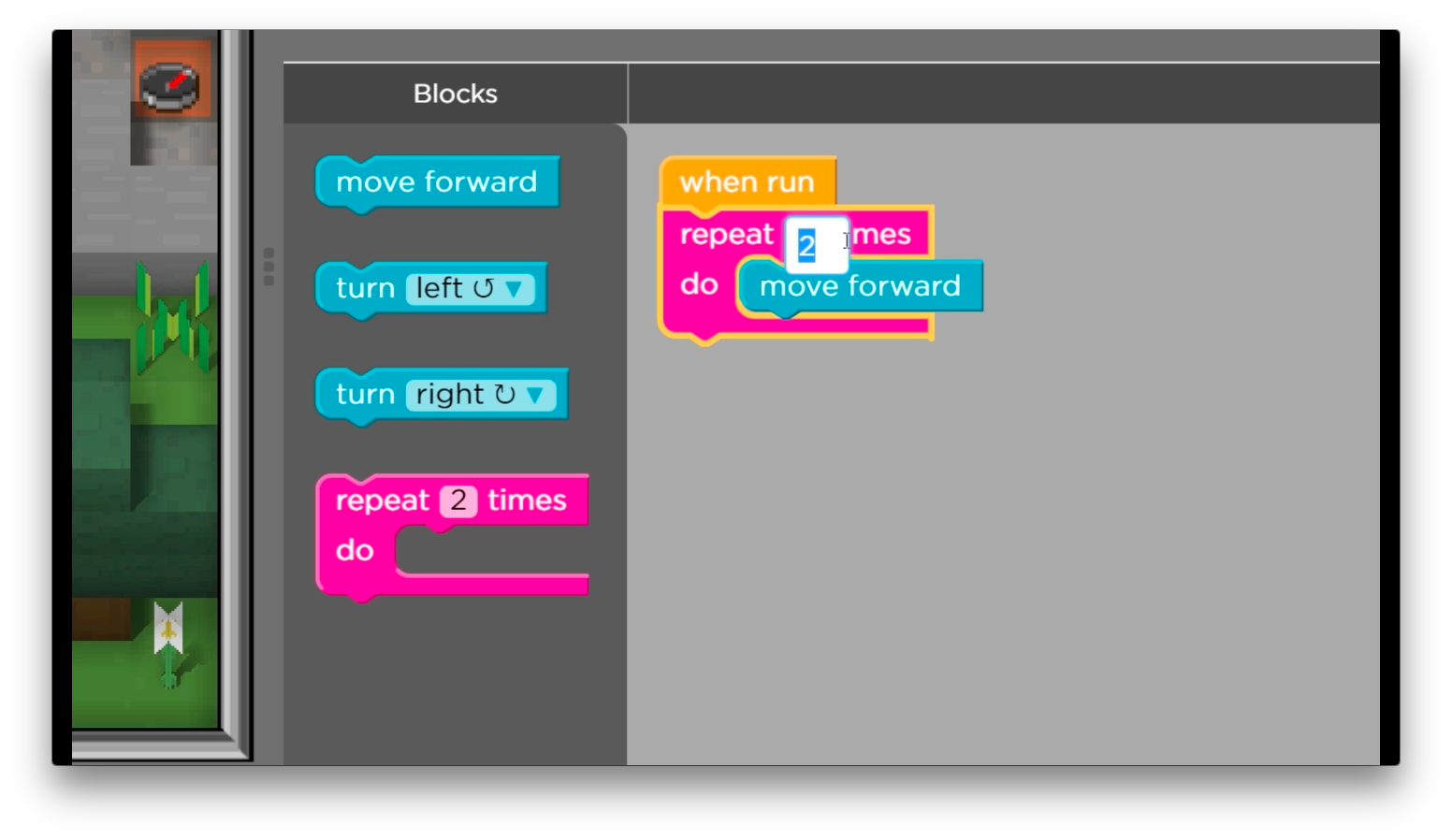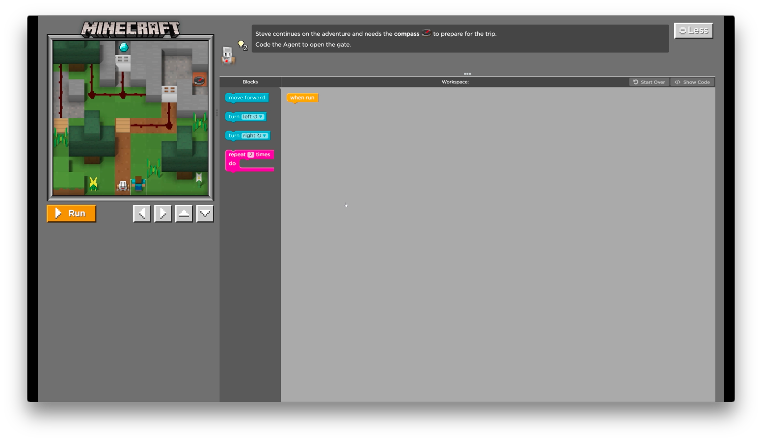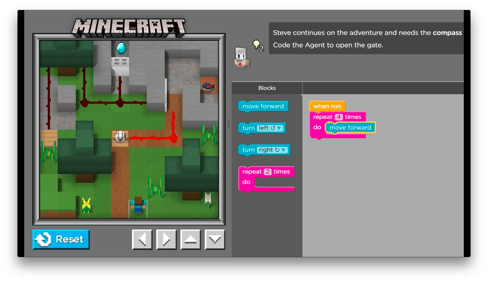 You can put turns and multiple commands in the repeat block too, but for now try using a repeat to move the Agent forward a few steps. Remember, if you get stuck on a puzzle you can always hit the blue reset button and try again.