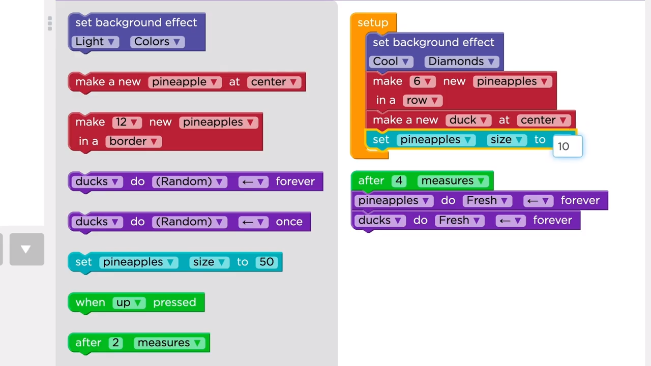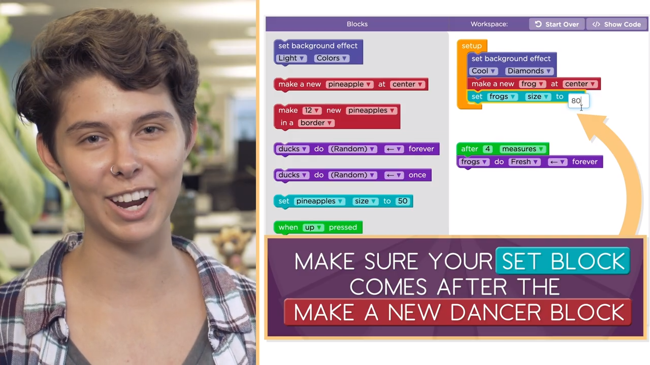 Remember, you can only set the properties of a dancer that already exists. Make sure that your set block comes after the "Make a new dancer" block. Feel free to experiment be creative, and have fun!