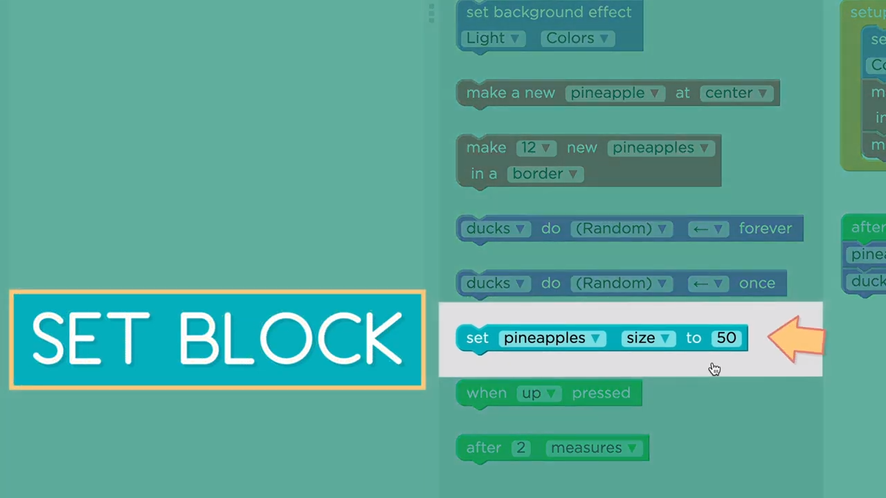 To change the properties of a dancer you'll use a set block. Let's use a set block to make our dancers look smaller. First, drag the set block into your program.