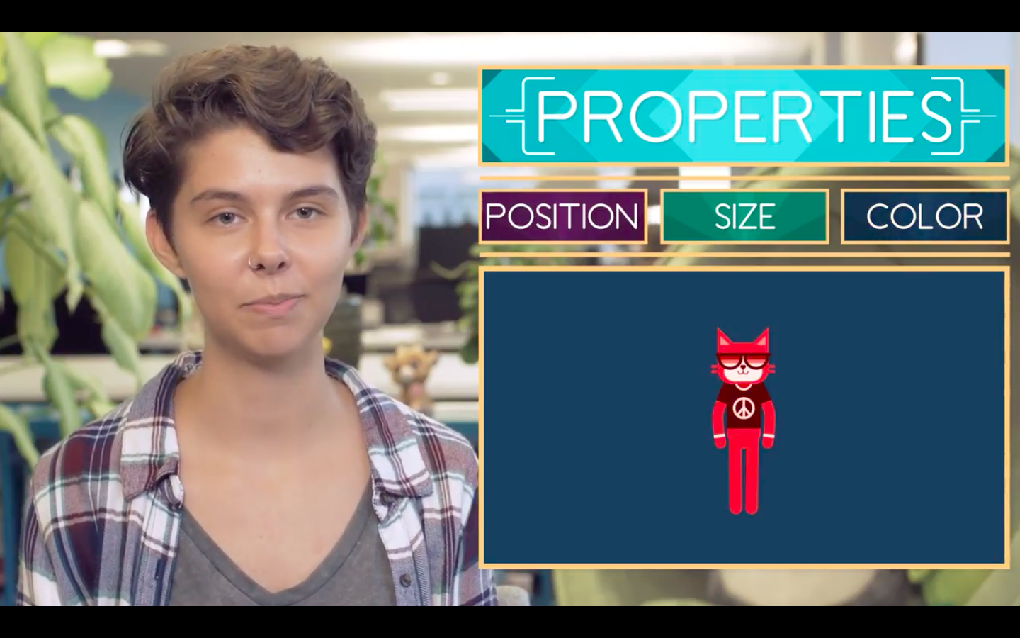 Not only can you change your dancer's moves, you can also change a dancer's properties. Properties describe things like the dancer's position on the screen, the dancer's size, and the dancer's color.